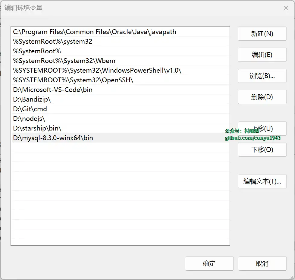 第二步,添加环境变量,在系统变量的 Path 下新增指向 MySQL 的 bin 目录。
