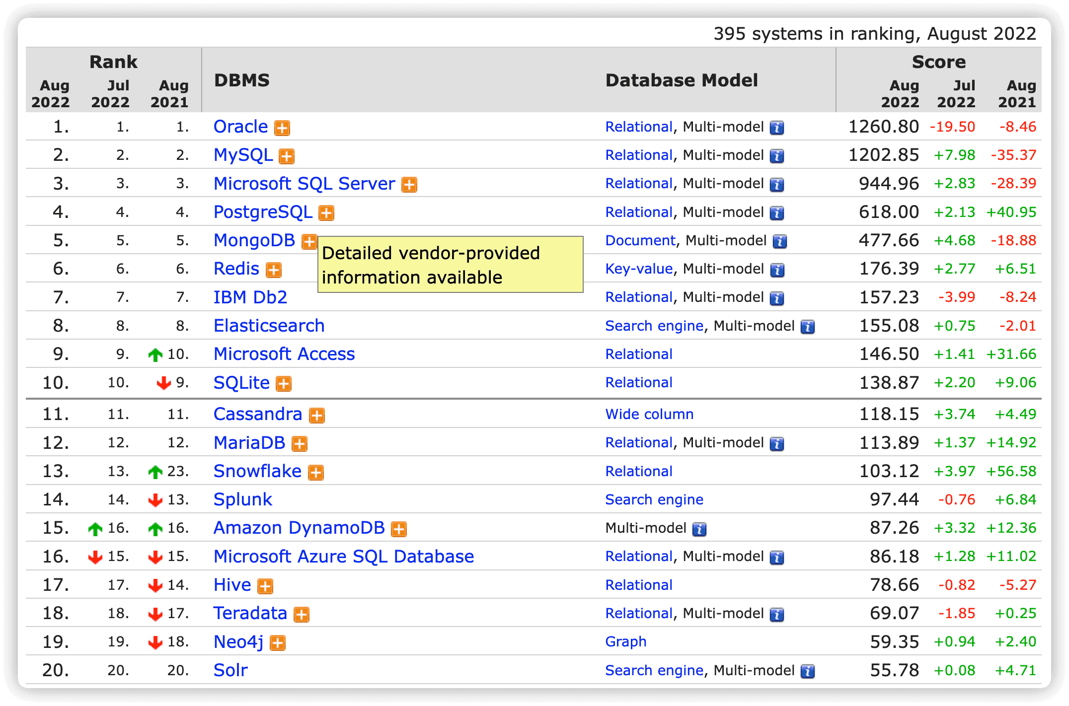 以上两张图片是截止 2022 年 8 月份市场上各大数据库的市场占有率,可以看到 MySQL 无论是在现在,还是从历年的排名来看,排名都是较为靠前的。所以不缺乏使用 MySQL 的使用场景,也从侧面说明学好 MySQL 尤其重要。