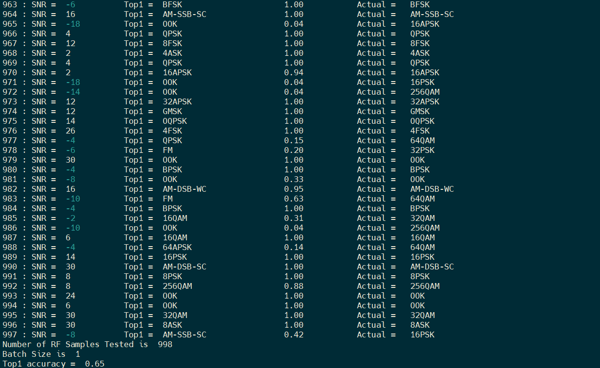 The RF frames, snrs, and modulation classes are read from the files rf_input.npy, rf_snrr.npy, rf_classes.npy. The Top1 accuracy should be close to what was measure for the quantized model. As we saw when evaluating the models in the Juptyer notebook, the classification is more accuate for higher SNRs.