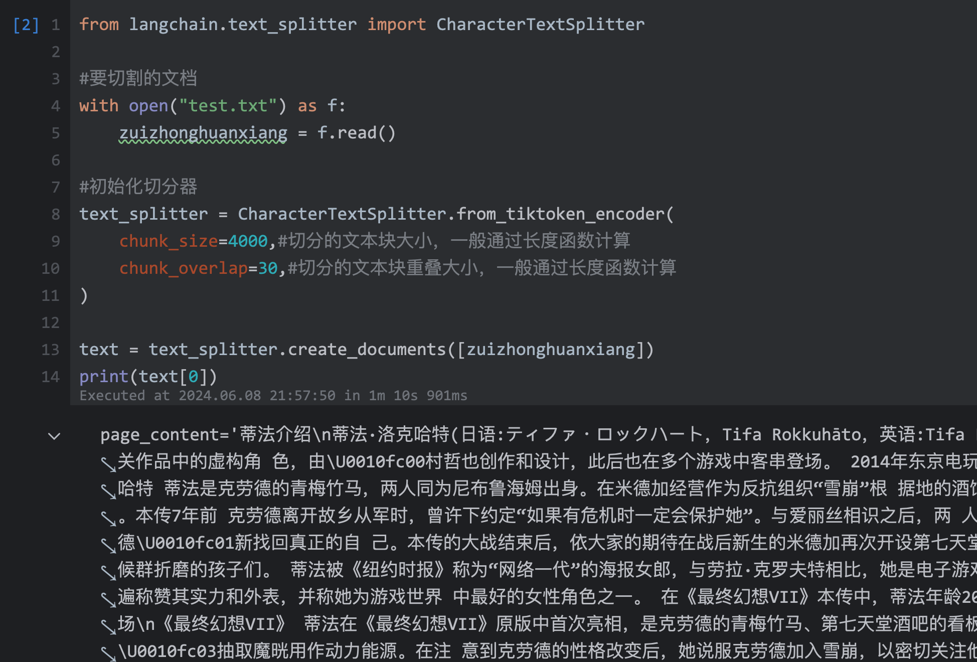 | 30 | +text = text_splitter.create_documents([zuizhonghuanxiang]) |