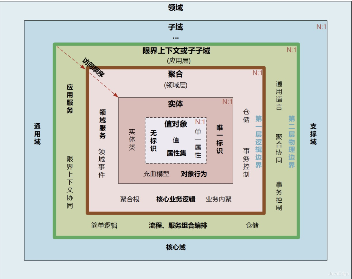 | 56 | +DDD 核心知识体系包括:领域、子域、核心域、通用域、支撑域、限界上下文、实体、值对象、聚合和聚合根等: |