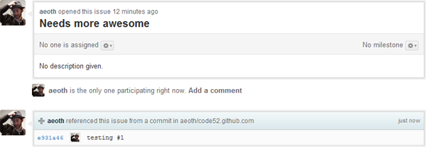 ###Step 2: Pick and issue, any issue. Be an issue! Normally you'd easily be able to make a fork, branch and commit up changes, but in Code52 projects we're moving very quickly and can quickly pick up people. It's a good idea to 'stake your claim' on a bug or feature to fix up so that two people aren't working on the same thing.